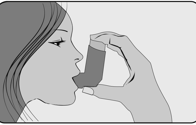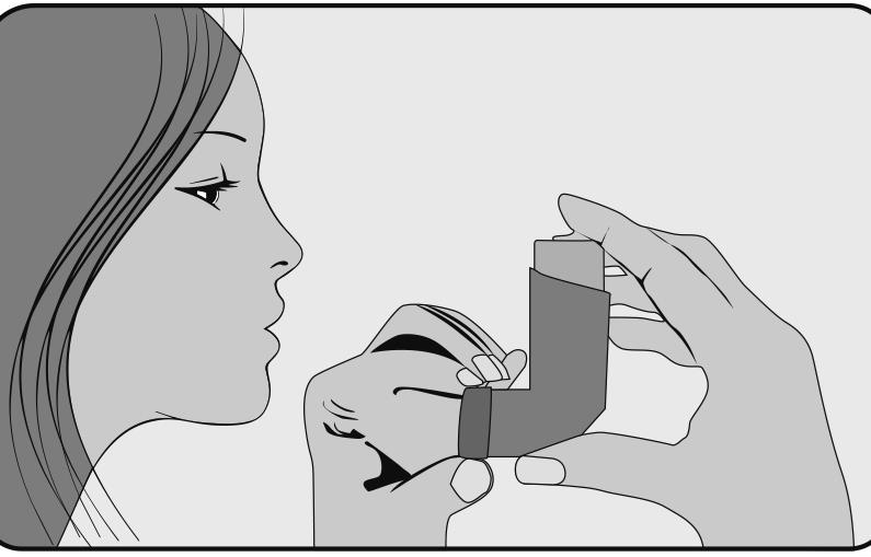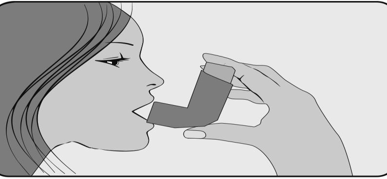 5. Tuż po rozpoczęciu wdechu przez usta, nacisnąć palcem wskazującym górną część inhalatora w celu uwolnienia dawki leku, wykonując jednocześnie powolny i głęboki wdech. Należy uważać, aby dawka leku nie wydostała się przez górną, dolną lub boczne części ust.