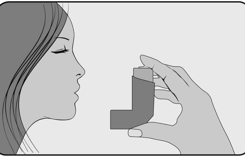 6. Wstrzymać oddech, wyjąć inhalator z ust i zdjąć palec wskazujący z górnej części inhalatora. Nadal wstrzymywać oddech przez około dziesięć sekund lub tak długo, jak to możliwe. Wykonać powolny wydech przez usta. Należy unikać dmuchania do inhalatora.